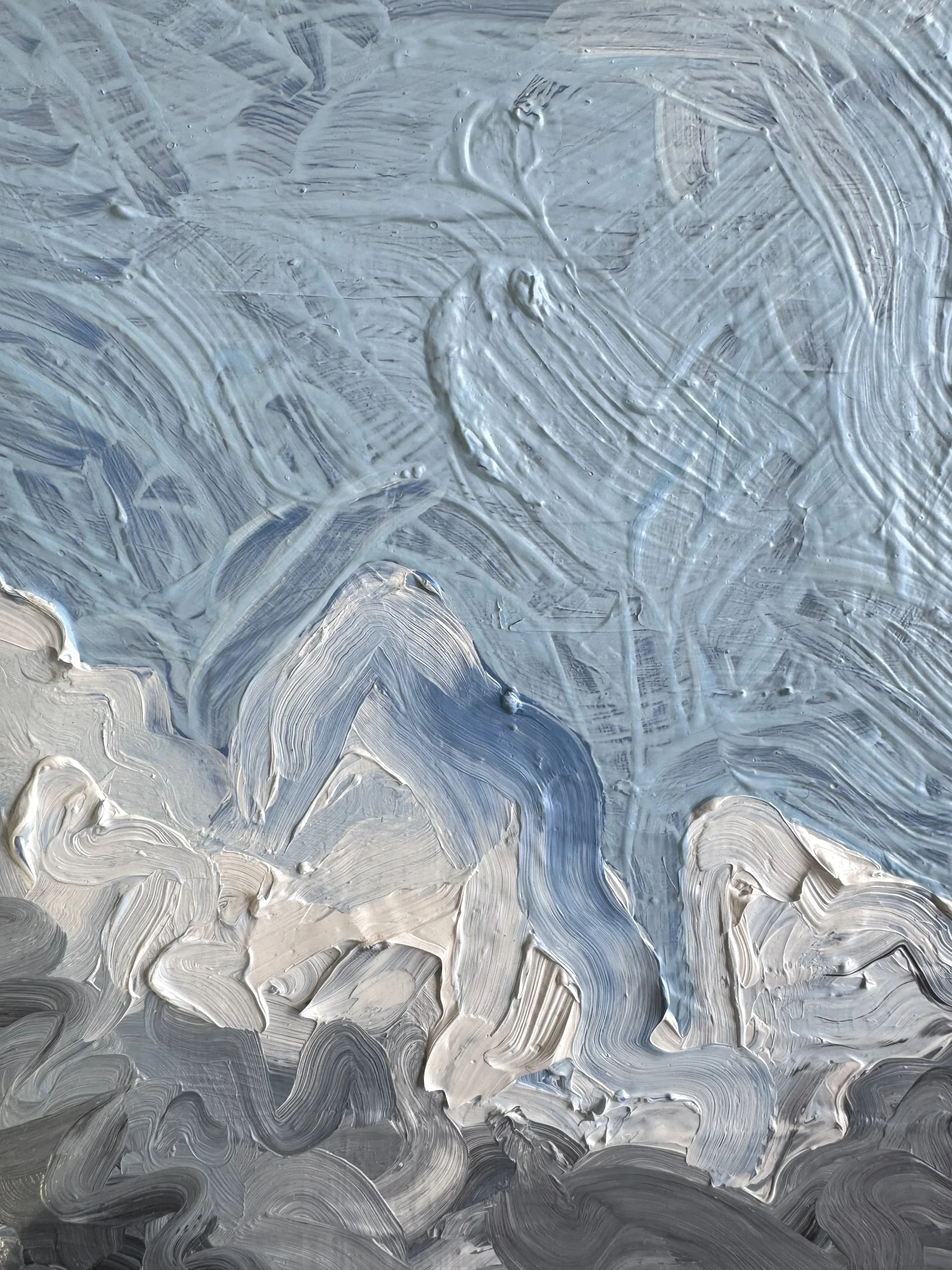 Each painting is built through cycles of painting and removal. Thick impasto oil is laid down and reworked, with successive skies painted over earlier ones until the surface reaches a point of resolution. What appears as a singular image is constructed through accumulation. Earlier states remain active within the final surface.