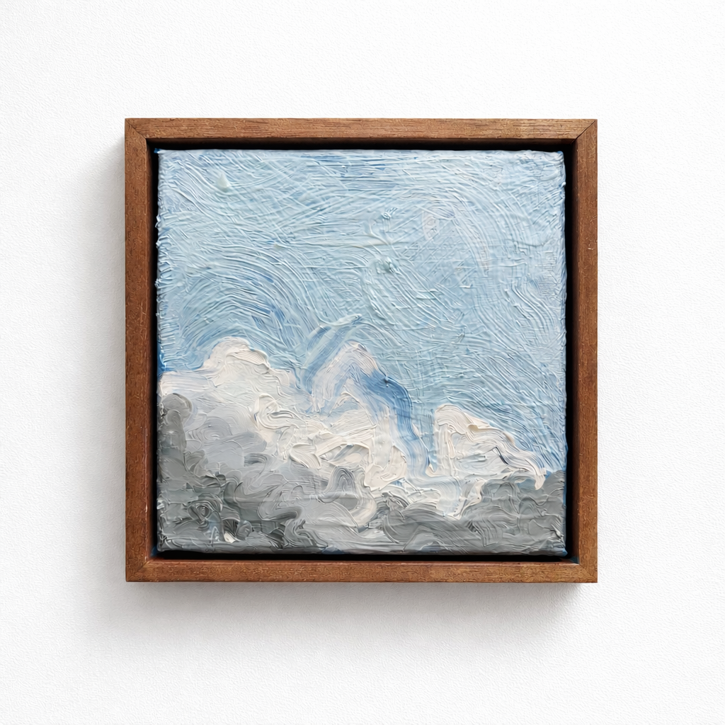 Built through layered impasto oil, successive skies are painted over one another until the surface resolves, holding multiple atmospheric states within a single image.